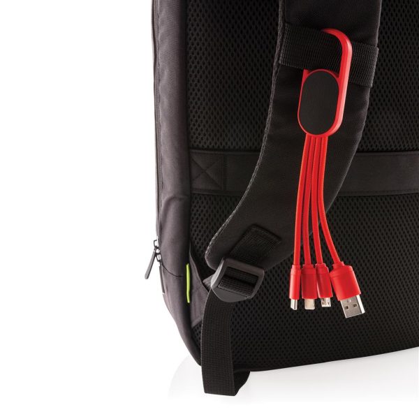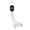4 in 1 charging cable with carabiner. USB input plug and for output: double-sided connector for IOS devices, micro USB and type C output. Suitable for charging all common mobile devices.