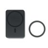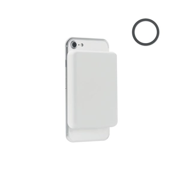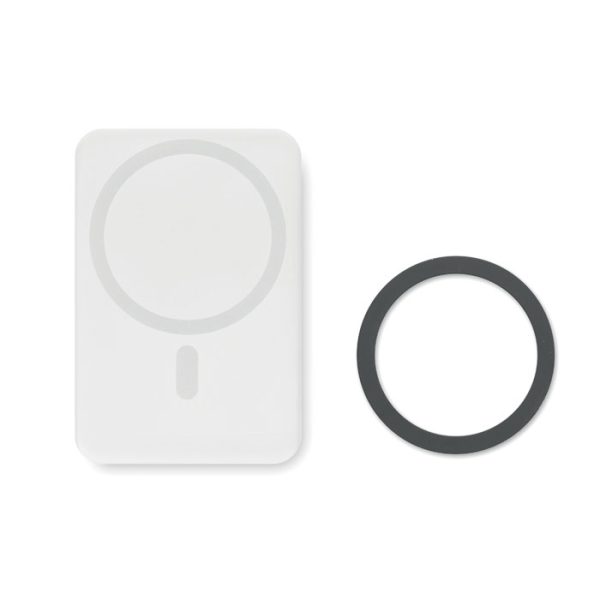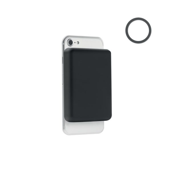 Magnetic wireless charger (15W) and power Bank (5000 mAh). Output: DC 9V/1.66A (15W) ideal for quick charging. Compatible with iPhone® 12 and newer. Including additional magnetic metal ring to support charging of other non-magnetic wireless chargeable phones.